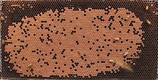 5. Identify brood cells. You are looking for capped cells that looks like those in the picture. They will appear brownish and look a little like leather. The more capped cells, the more brood. A queen who is actively laying brood is a healthy queen who is confident that she reigns over a healthy hive that can adequately support the feeding of new bees.