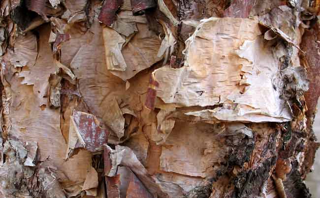 The peeling bark creates a mosaic of texture and color that changes color over the life of the tree. Young river birch exhibits a silvery, gray bark that peels to reveal pinkish or light-reddish brown patches that deepen to a dark brown or black as the tree ages.