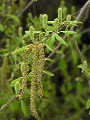 In the fall, the tree produces drooping, reddish-brown male flowers called catkins that remain throughout the winter. In the spring the male catkins bloom and produce pollen to pollinate spring-formed upright female catkins that turn into the tree’s fruit.